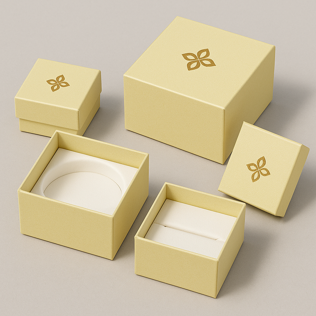 Caixas desenvolvidas especialmente para anéis, colares e pulseiras, produzidas em papel cartão de alta qualidade. Oferecemos opções com acabamentos sofisticados como hotstamping, laminação fosca ou brilho.
