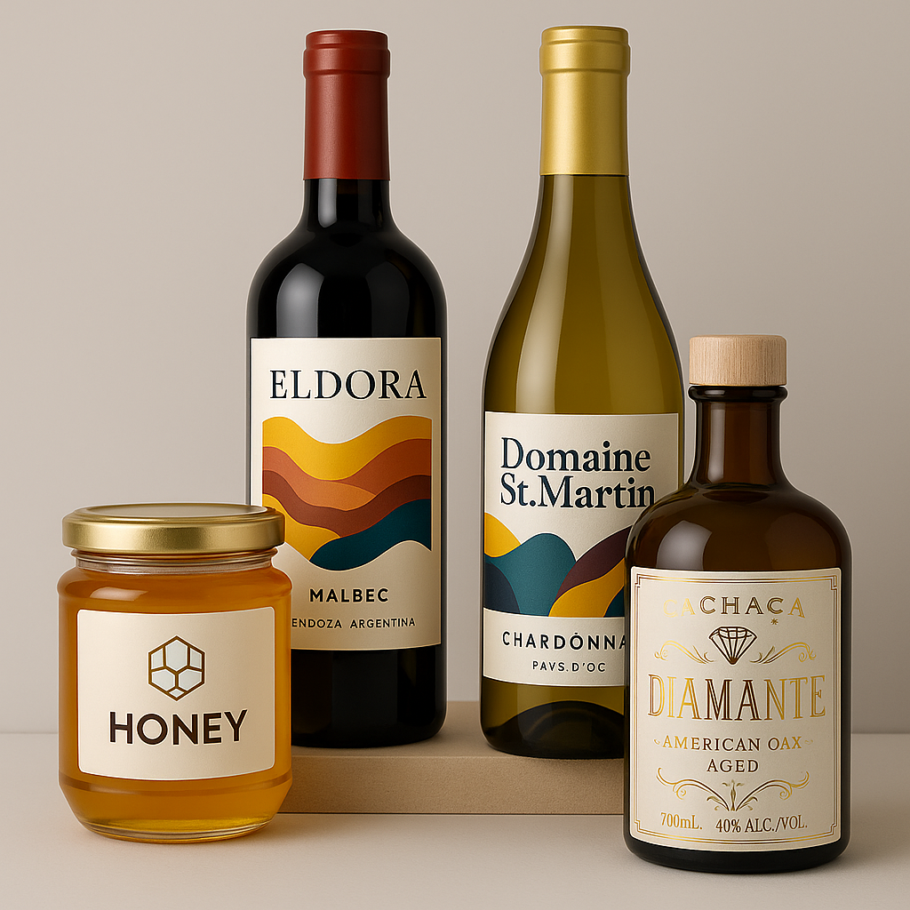 Produzimos rótulos para qualquer tipo de frasco, com impressão de alta qualidade e possibilidade de acabamentos especiais, como hot stamping, laminação e cortes especiais.