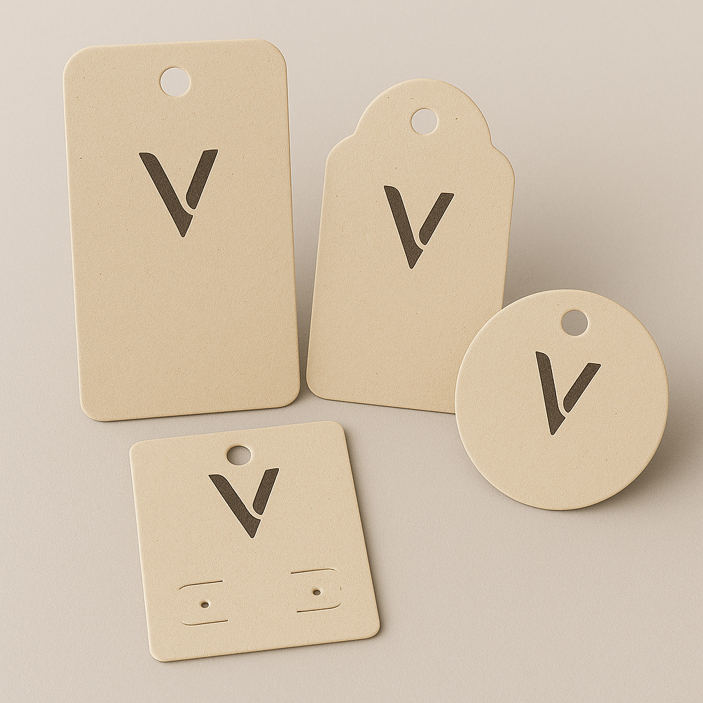 Produzimos tags para brincos, colares, vestuário e outros itens, com diversas formas, tamanhos e acabamentos.